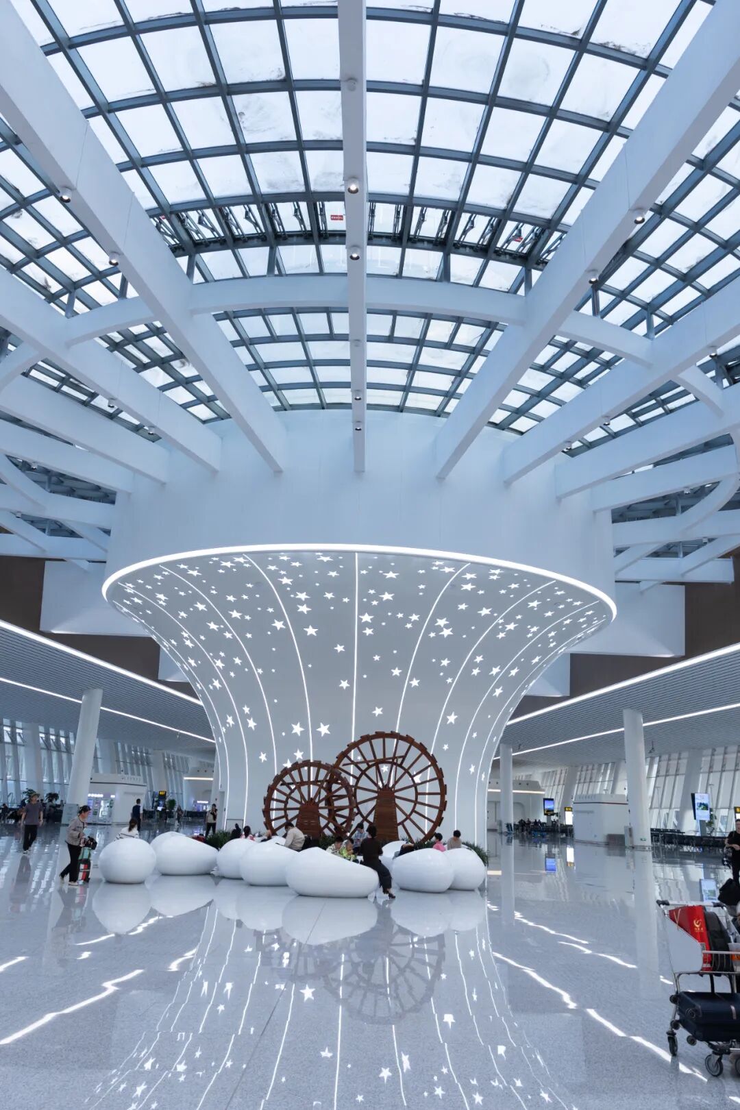 考虑到机场全天候运营的特性,三雄极光全方位配合智控系统。从晨光微露到夜深人静,系统每隔一小段时间自动进行一次光线调节。当凌晨航班落地,智能调光系统将色温降至2700K,柔和的暖光倾洒而下,宛如黄河落日余晖,抚慰着深夜归乡或启程旅客疲惫的身心,让他们在异乡也能感受到家一般的宁静与温暖。
