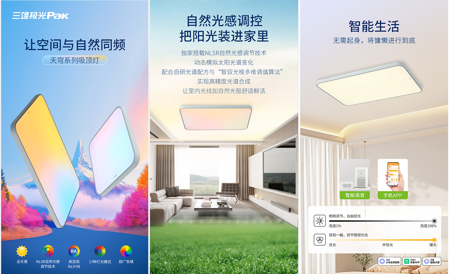 从产品特点来看,三雄极光全光谱照明优势明显。通用优势体现在健康护眼方面,Ra≥97 高显指,全光谱,CQS≥98 光色品质,RG0 豁免伤害级别,防眩光 UGR≤19,支持无极调节;光感舒适,光线均匀柔和、大角度广覆盖、精准控光无杂散、背发光间接照明;智能便捷,具备无极调光、多种预设光模式、智能 App/语音控制、快装结构、光源可替换等特点;设计美观,超薄贴顶、窄边框、隐形设计、背发光显层高、多种面环/配色可选;耐用可靠,采用优质散热材料(如铝材)、一体化密封防尘、高效散热减少光衰、长效寿命。